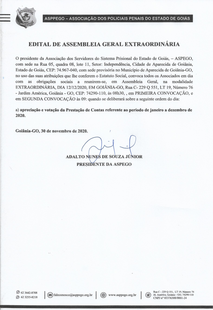 O presidente da Associação dos Servidores do Sistema Prisional do Estado de Goiás, – ASPEGO, com sede na Rua 05, quadra 08, lote 11, Setor: Independência, Cidade de Aparecida de Goiânia, Estado de Goiás, CEP: 74.967-040, com sede provisória no Município de Aparecida de Goiânia-GO, no uso das suas atribuições que lhe conferem o Estatuto Social, convoca todos os Associados em dia com as obrigações sociais a reunirem-se, em Assembleia Geral, na modalidade EXTRAORDINÁRIA, DIA 12/12/2020, EM GOIÂNIA-GO, Rua C- 229 Q 551, LT 19, Número 76 – Jardim América, Goiânia – GO, CEP: 74290-110, às 08h30, , em PRIMEIRA CONVOCAÇÃO, e em SEGUNDA CONVOCAÇÃO às 09:30 quando se deliberará sobre a seguinte ordem do dia: